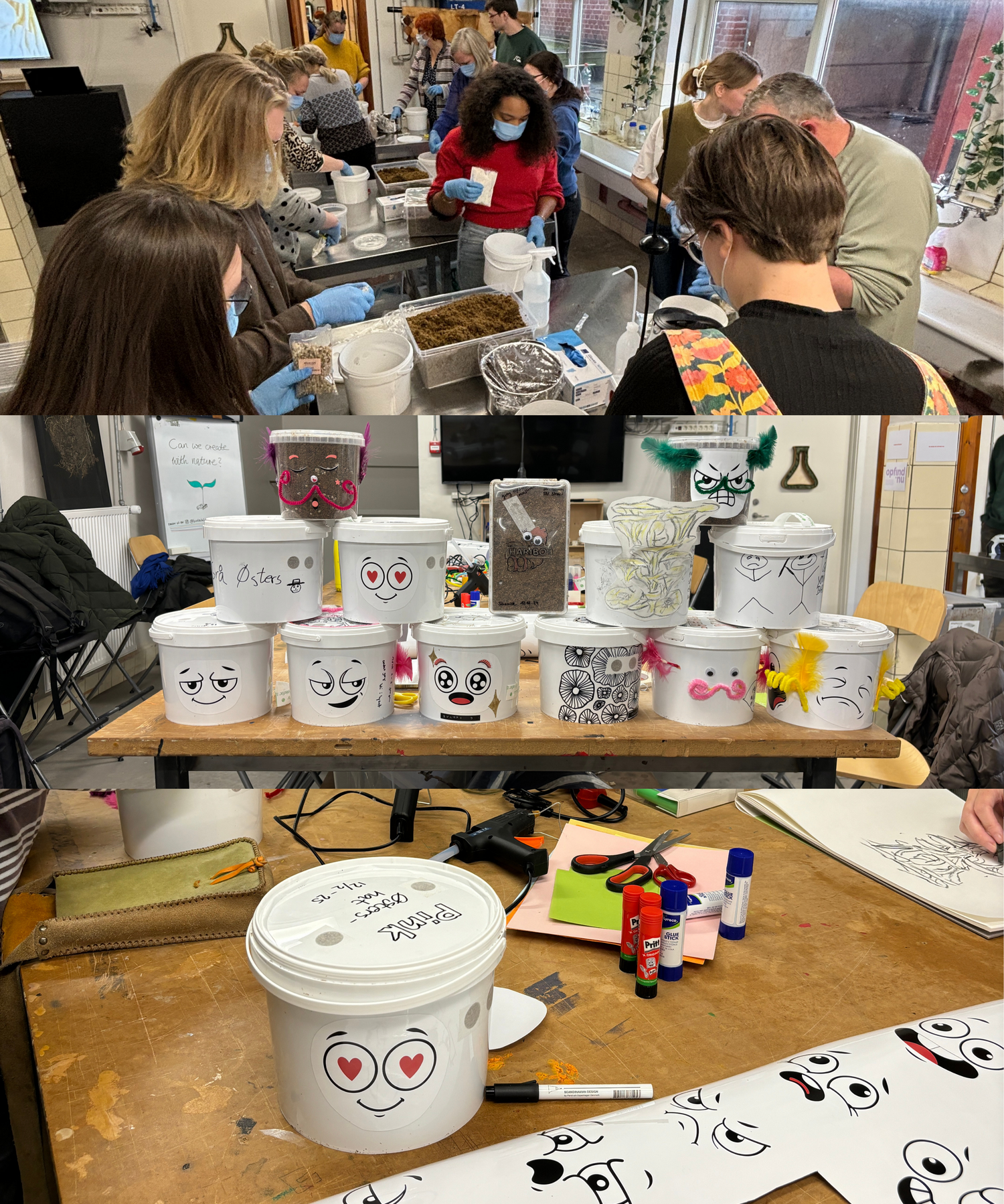 - Pasiruošus kibirėlį, metas jį padekoruoti! Dalyviai skatinami sukurti kibirėliui savą personažą ir vardą, jį papuošti naudojant įvairias dekoracines priemones (lipdukai, spalvoti markeriai, juostelės, popierius, plunksnelės ir t.t.).
